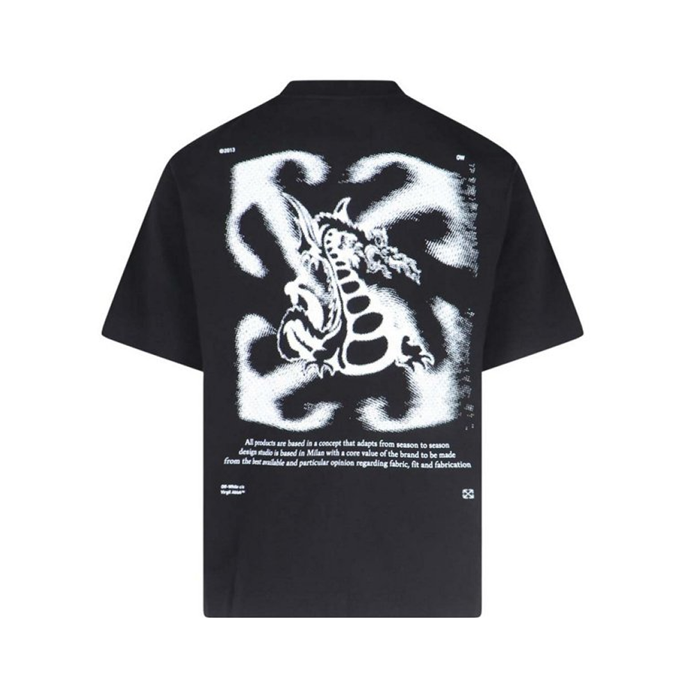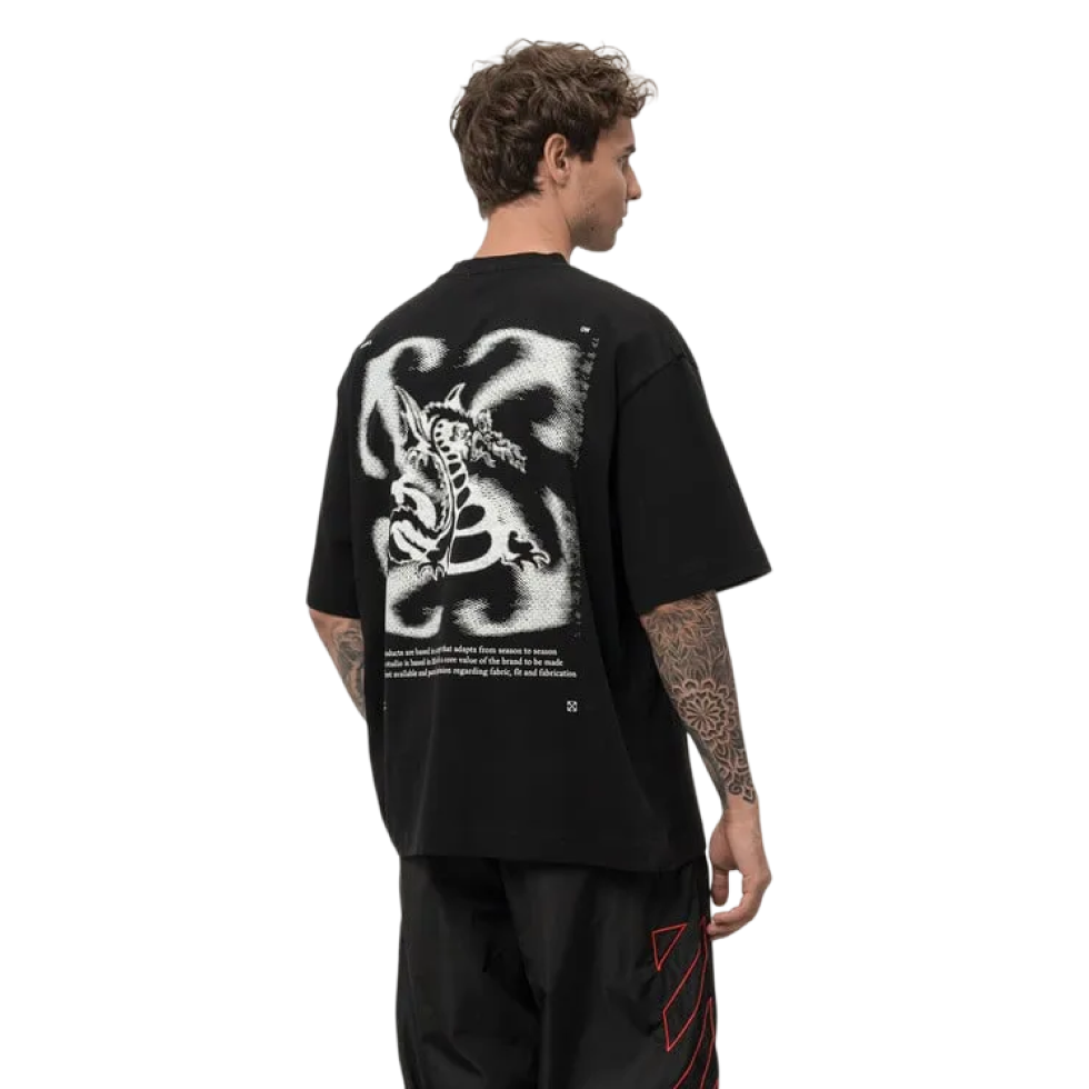 OFF-WHITE Dragon Arrow T-Shirt Black — стильна чорна футболка з фірмовою графікою Dragon Arrow, що поєднує міфологічний образ дракона з культовою айдентикою Off-White та сучасною стрітстайл-естетикою.