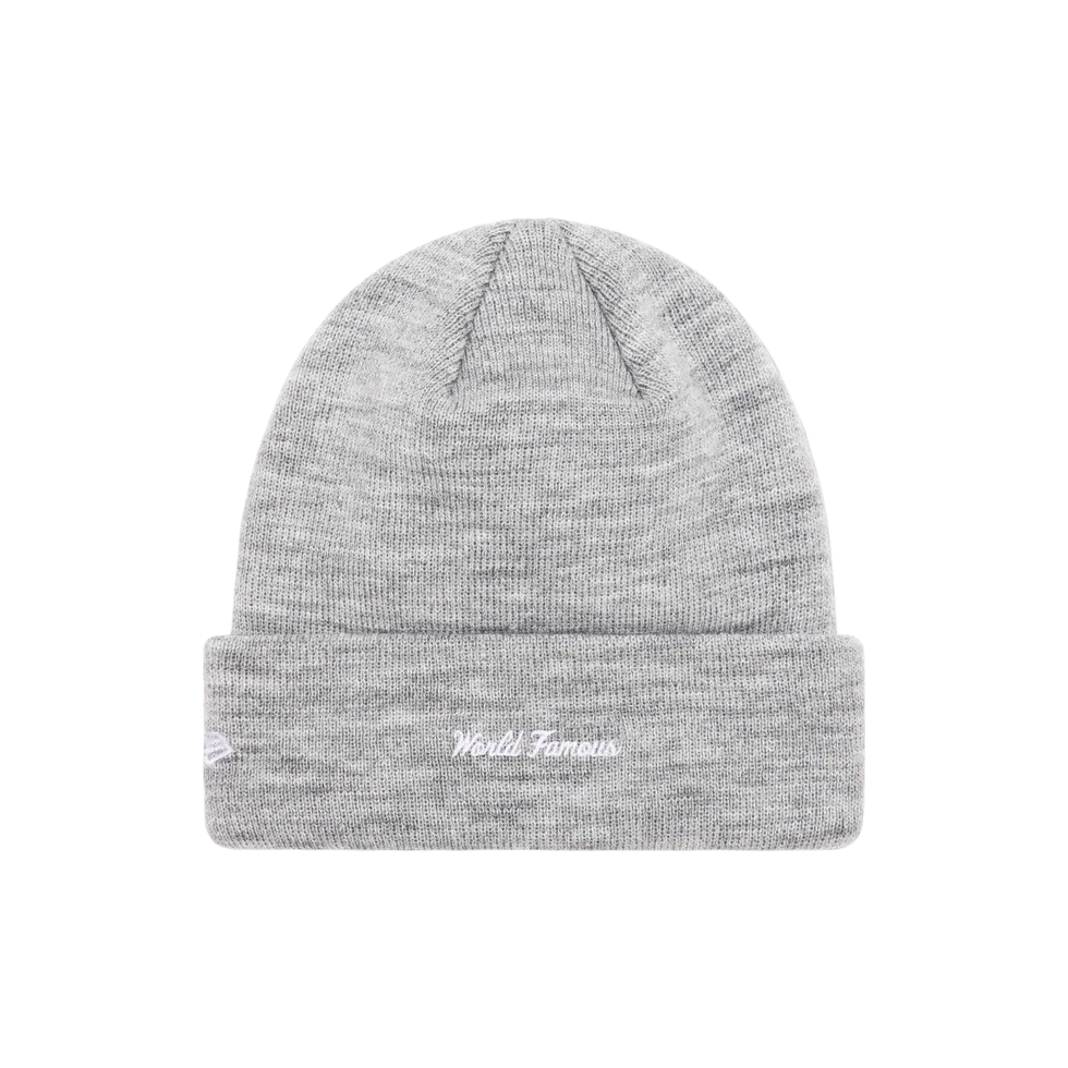Supreme New Era Box Logo Beanie Heather Grey — стильна шапка біні світло-сірого кольору з культовим логотипом Supreme, що поєднує функціональність, тепло та впізнавану стрітстайл-естетику бренду.