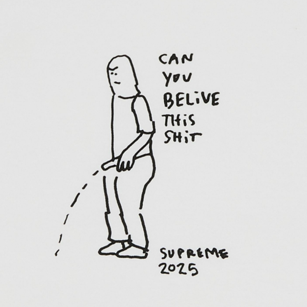 Supreme Piss Tee White — класична біла футболка з провокаційним графічним принтом, що поєднує гумор, streetwear-естетику та впізнаваний стиль бренду Supreme.