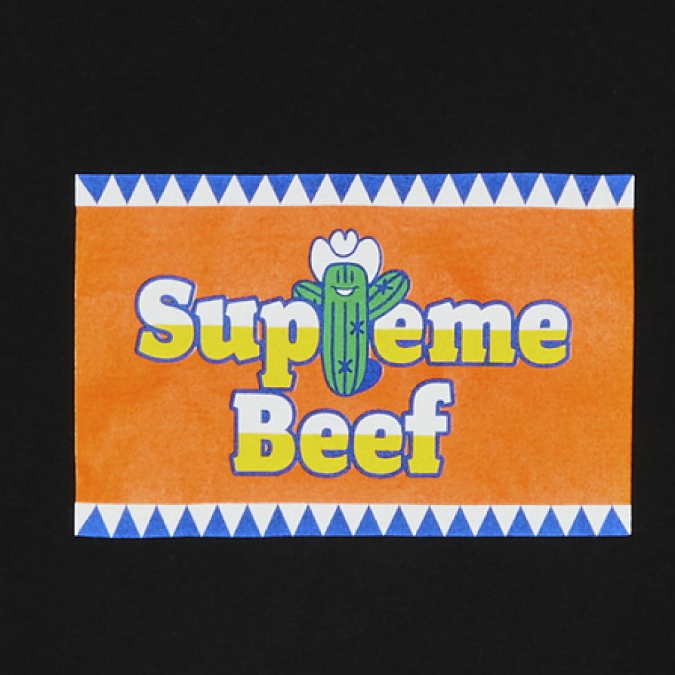 Supreme Beef Tee Black — класична чорна футболка з яскравим графічним принтом, що поєднує streetwear-естетику, гумор і впізнаваний стиль бренду Supreme.