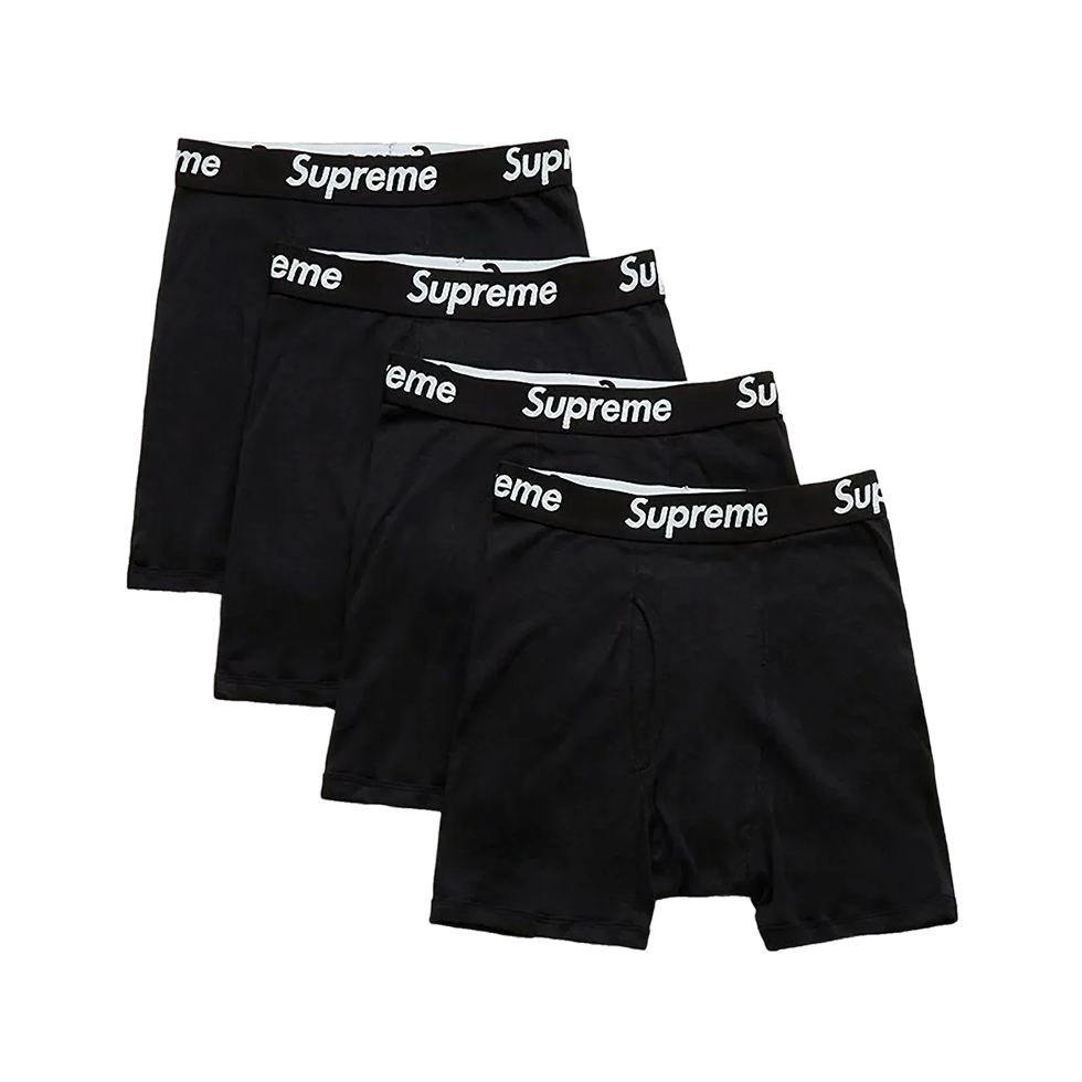 Supreme® x Hanes® Boxer Briefs (4 Pack) Black — базові чоловічі боксерські труси у чорному кольорі, що поєднують комфорт, високу якість матеріалів і фірмову естетику колаборації Supreme® та Hanes®.
