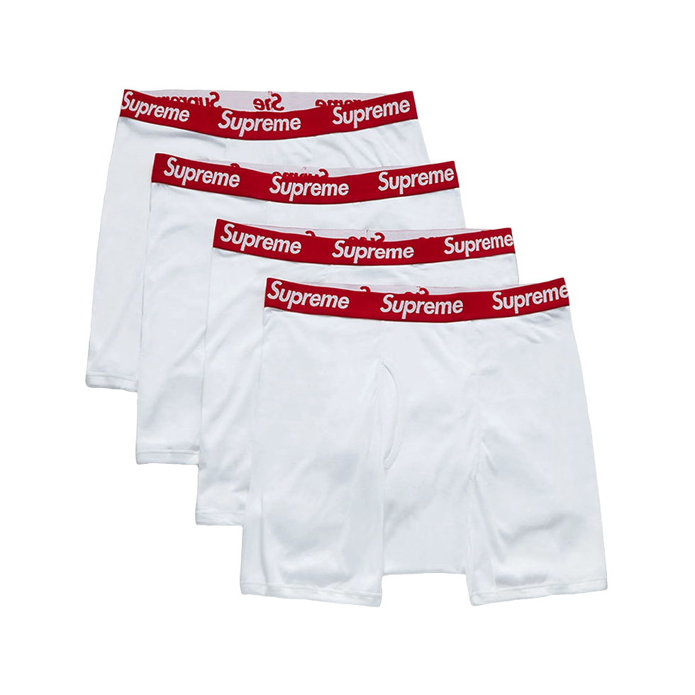 Supreme® x Hanes® Boxer Briefs (4 Pack) White — базові чоловічі боксерські труси в білому кольорі, що поєднують комфорт, високу якість матеріалів і впізнавану естетику колаборації Supreme® та Hanes®.
