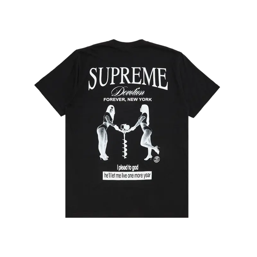 Supreme Devotion Tee Black — класична чорна футболка з принтом Devotion, що поєднує комфорт, стиль і впізнавану естетику бренду Supreme.